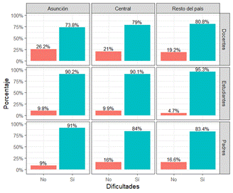 Figura 1. Porcentajes de Docentes, Padres y Estudiantes según manifestación de dificultades en Asunción, departamento Central y el resto del país.