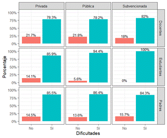 Respecto a las dificultades presentadas a estos mismos actores educativos, según el tipo de institución a la que asisten, se pudo apreciar similares comportamientos en los porcentajes en comparación a la desagregación por zona o departamento de residencia. Sin importar mucho que la institución de procedencia sea Pública, Privada o Subvencionada, más de 78% respondió que sí tiene dificultades. De nuevo, los estudiantes expresaron con mayor frecuencia tener alguna situación problemática en esta modalidad de enseñanza (Figura 2).